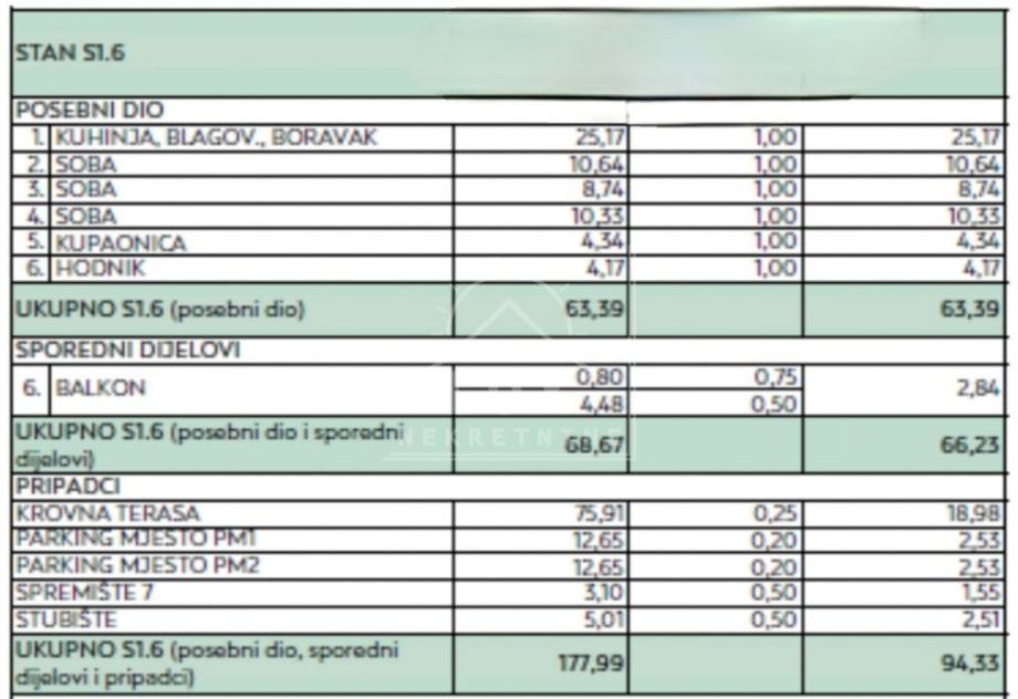 Ukupna površina stana sa svim pripatcima iznosi: 94,33 m2.
