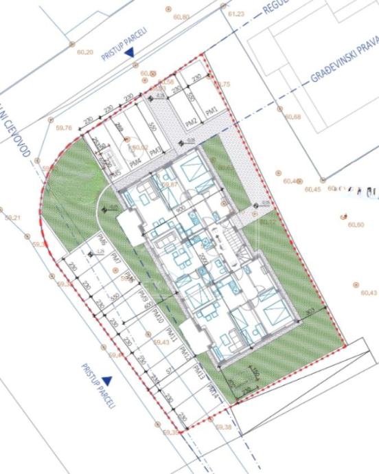 Dvije stambene zgrade u izgradnji, prva ima 7 stambenih jedinica i svakom stanu pripadaju dva parkirna mjesta na okućnici zgrade (zgrada A), druga ima 6 stambenih jedinica i podzemnu garažu s parkirnim mjestima (zgrada B).