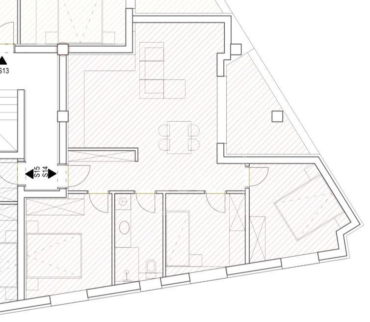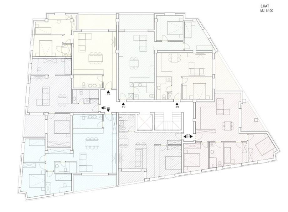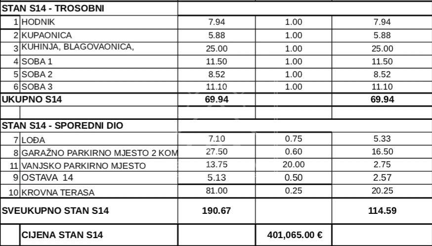STAN S14 na 3. katu S KROVNOM TERASOM, trosoban, sastoji se od hodnika, kuhinje s blagovaonicom i dnevnim boravkom (pov. 25 m2), tri spavaće sobe (pov. 11.50 m2, 11.10 m2 i 8.52 m2), kupaonice (pov. 5.88 m2) i loggia-e (pov. 7.10 m2 x 0.75 = 5.33 m2).