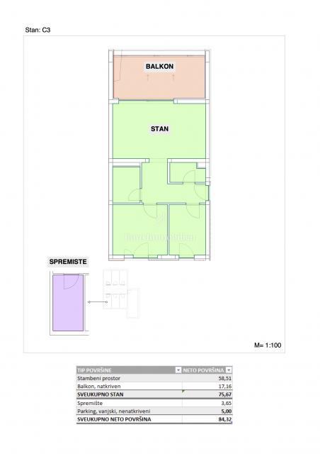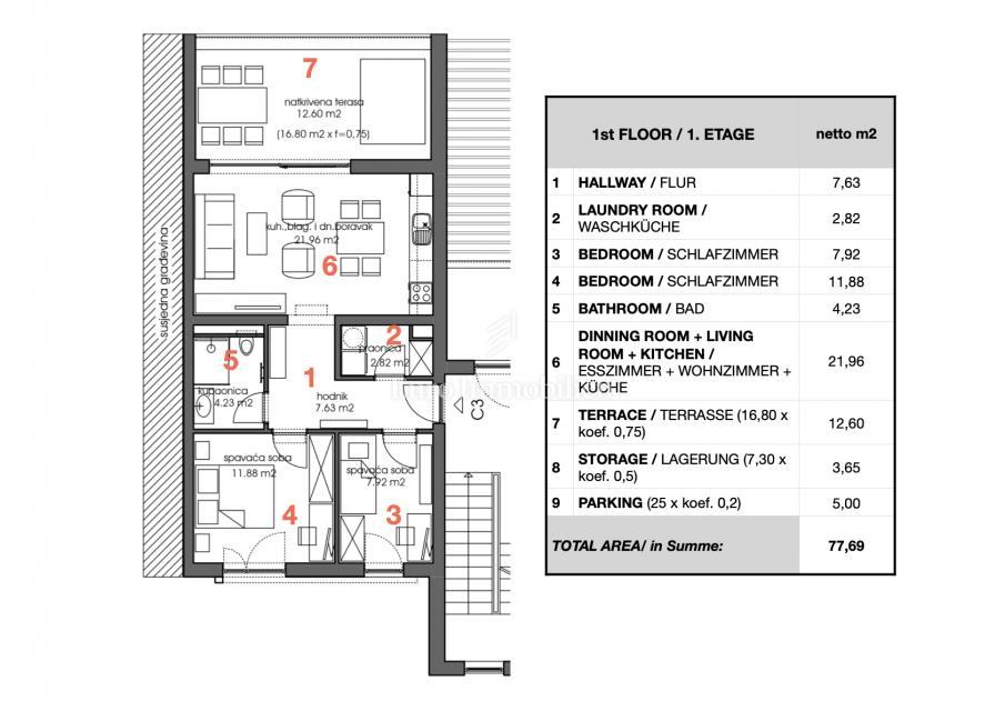 Smješten u novoj zgradi vrhunske kvalitete, koja se trenutno gradi, ovaj stan površine 77,69 m² idealan je za obiteljski život ili kao unosna investicija.