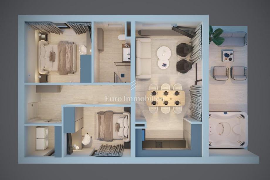 Stan uključuje 2 spavaće sobe, otvoreni koncept kuhinje, blagovaonice i dnevnog boravka, terasu, ostavu u podrumu za sezonske stvari i bicikle te vrt.
