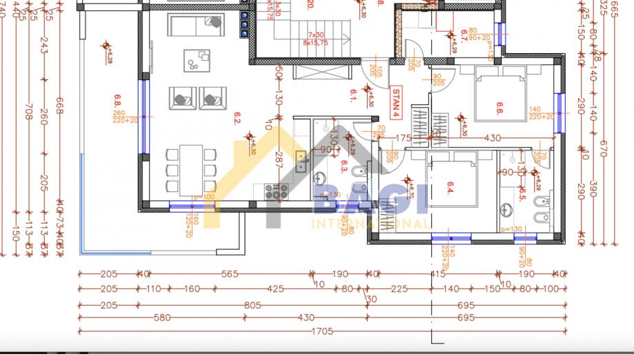 Zgrada će biti visokog standarda opremljena solarnim sustavom, podnim grijanjem, električnim roletama, liftom, pvc troslojnom stolarijom, 15cm izolacijom...