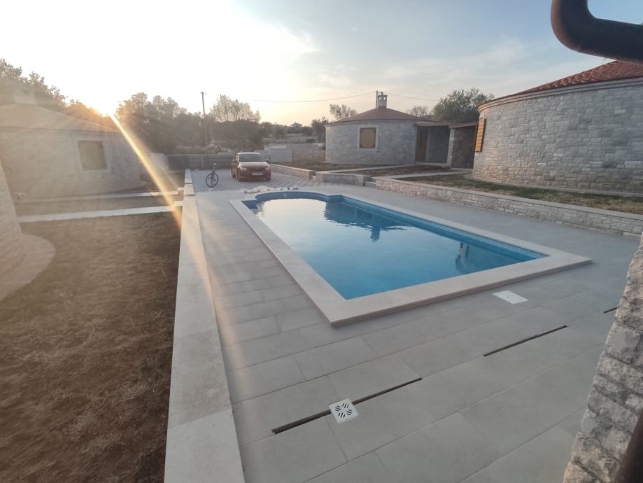 - svakoj kući pripada zasebno dvorište, a između kuća se nalazi bazen dimenzija 3,5 m x 7,5 m sa sunčalištem i strojarnicom / spremištem,