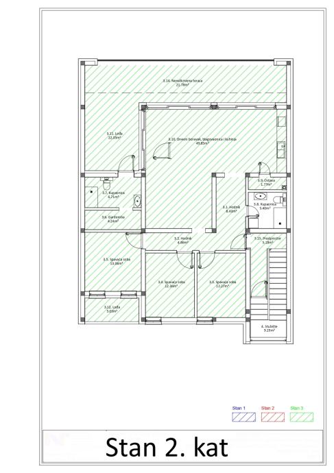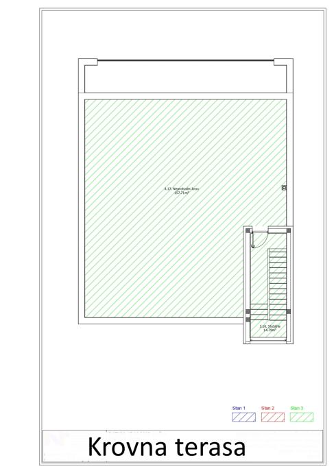 Stanu pripada cijelo stubište i hodnik drugoga kata te cijeli krov zgrade sa vlastitim izlazom površine 158 m2 koji se može urediti kao privatna terasa/dvorište. Na krovu su izvedeni i voda i odvod za daljnje postavljanje jacuzzia/bazena.