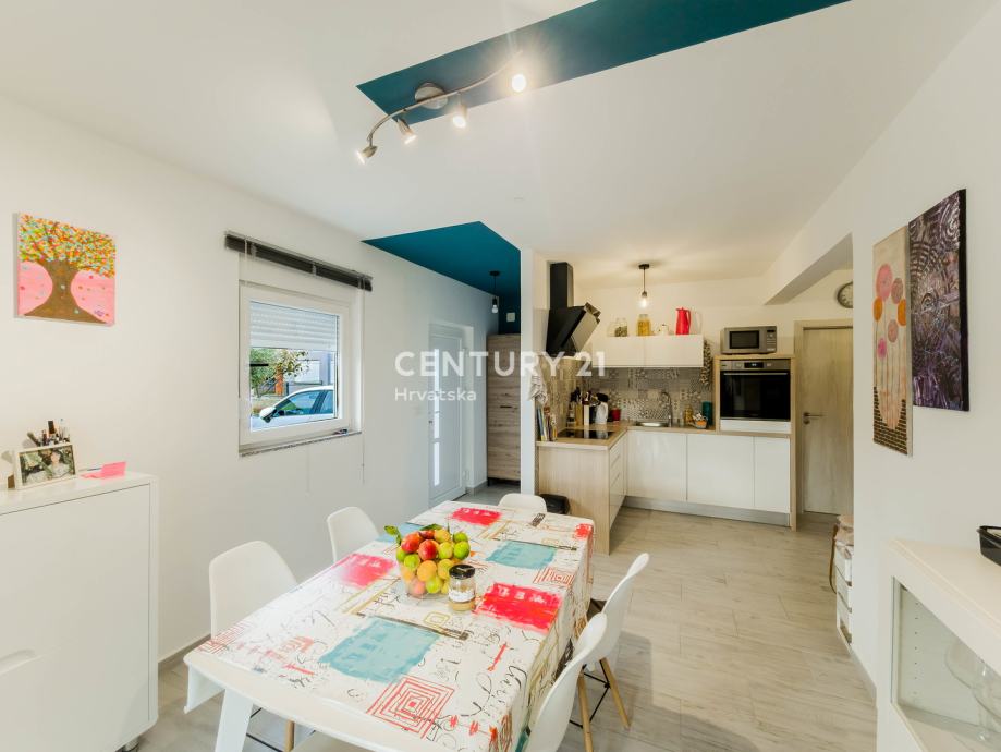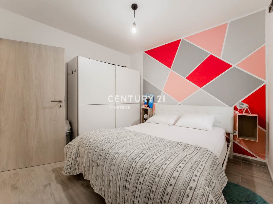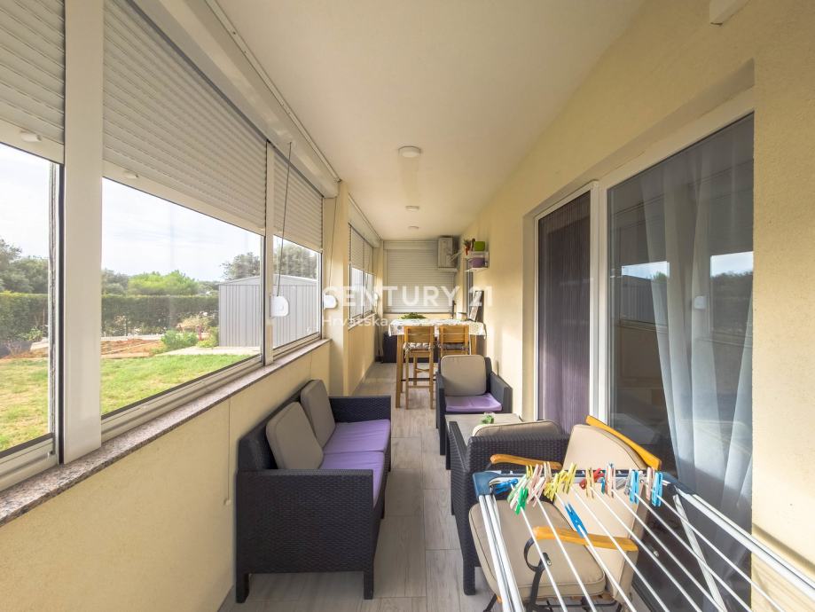 Stan je potpuno namješteni i opremljeni te je odmah useljiv što uključuje namještenu i opremljenu kupaonicu sa tušem, kuhinju sa ugradbenim uređajima, veliki hladnjak, blagovaonski stol i stolice sa komodom, dnevni boravak sa sjedećom garniturom, regalom, 2 namještene spavaće sobe sa krevetima i ormarima, vrtna garnitura na terasi.