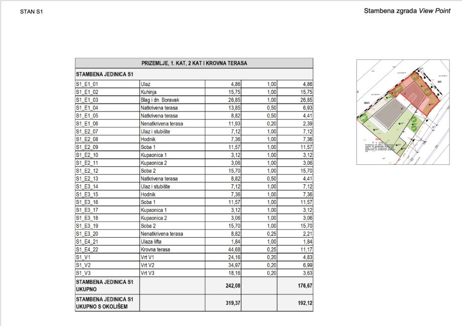 Stan površine 211 m2 sastoji se od tri etaže, prizemlja, prvog i drugog kata. U prizemlju se nalaze kuhinja, blagovaona, dnevni boravka, dvije natkrivene i jedna nenatkrivena terasa, na prvome katu su dvije spavaće sobe s vlastitim kupaonicama isti takav raspored je i na drugome katu odnosno dvije spavaće sobe s kupaonicama. Stanu još pripada krovna terasa tlocrtne površine 44 m2. Cijeli stan je povezan unutarnjim stubištem ali i liftom koji ide od podrumske etaže/podzemne garaže do krovne terase, te na svakoj etaži ima izlaz što je rijetkost na tržištu i pristup stanu preko kartice ili šifre. Pripadci stanu su dva garažna parkirna mjesta i spremište ( P4, P5 i S5). S krovne terase se pruža panoramski pogled na more. Nalazi se u sklopu manje stambene zgrade od 4 stambene jedinice. Pri projektiranju se pazilo na svaki detalj da se budućim vlasnicima pruži što veći komfor i kvaliteta života. U izgradnji i opremanju se isključivo koriste materijali od renomiranih proizvođača i najviše klase. Neki od korištenih materijala i opreme su: stiropor fasada 15 cm, aluminijska stolarija s kliznim griljama, dizalice topline s zidnim ventilokonvektorima, podno grijanje u cijelom stanu...keramika/parket i pergola na krovnoj se ostavlja na izbor kupcu. Kupac ima pravo i na odabir pergole na krovnoj terasi. Raspored stana i pripadke možete vidjeti u priloženim tlocrtima. Ukupna tlocrtna površina stana s pripadcima je 357 m2. Nalazi se na mirnoj lokaciji udaljenoj 400 metara od mora. Završetak radova i useljenje se očekuje u siječnju 2026 godine. Više informacija na upit!