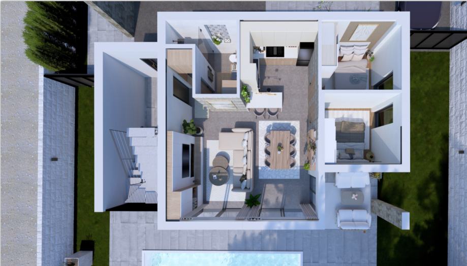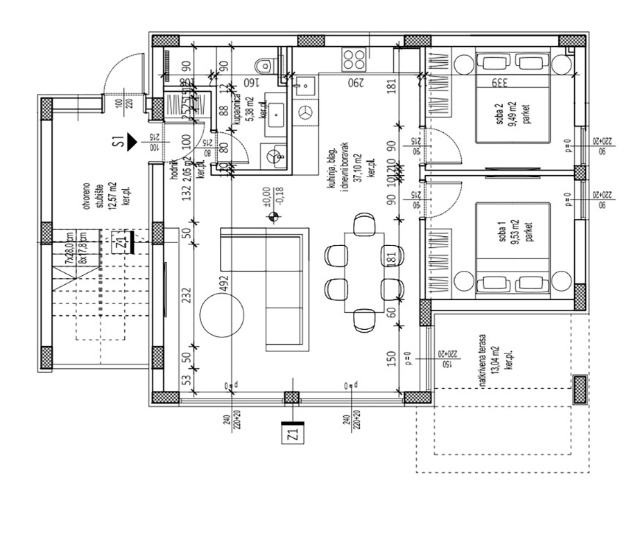 Punta skala, novogradnja, objekt sa ukupno četiri stambene jedinice 2. red od mora. Jedinstvena lokacija, idealna za odmor i opuštanje, svega nekoliko kilometara od grada Zadra, te blizine zračne luke Zemunik (10km). U prizemlju je na prodaju stan oznake S1, na sjeverozapadnom dijelu zgrade, a sastoji se od: kuhinje, blagovaonice i dnevnog boravka | 37,10m2 spavaće sobe 1 | 9,53 m2 spavaće sobe 2 | 9,49 m2 kupaonice | 5,38 m2 hodnika | 2,05 m2 UKUPNO veličina stana 63,55 m² Nekretnina ima sljedeće dodatne dijelove i pripatke: natkrivena terasa | 13,00 m² natkriveno parkirališno mjesto | 13,75 m² nenatkriveno parkirališno mjesto | 13,75 m² vanjska terasa | 58,24 m² vrt | 101,53 m² Ukupna površina stana S1 s dodatnim dijelovima i pripatcima iznosi 263,82 m², a ukupna korisna vrijednost površine iznosi 101,48 m². Stan u prizemlju imat će privatni vanjski bazen veličine 7,6×4 m u velikom privatnom vrtu. Krasit će ga velike staklene stijene koje, osim što daju stanu obilje dnevnog svjetla, omogućavaju pogled na bazen iz velikog dnevnog otvorenog prostora. Dvije sobe bit će uređene kao spavaće sobe s ugradbenim garderobnim ormarima i bračnim krevetima. Dnevni prostor uključuje L-kuhinju sa šankom i svim potrebnim aparatima, prostor za blagovanje sa stolom i 6 stolica te veliku sjedeću garnituru ispred koje se nalaze kamin i veliki TV ravnog zaslona. Elegantna kupaonica sadržavat će tuš kabinu te vertikalno postavljene perilicu i sušilicu rublja. Svi stanovi bit će uređeni s parketima i keramikom prve klase. U cijenu će biti uključena kompletna kuhinja s aparatima. Planirano useljenje je 10. mj. 2026. godine. Više informacija na upit.