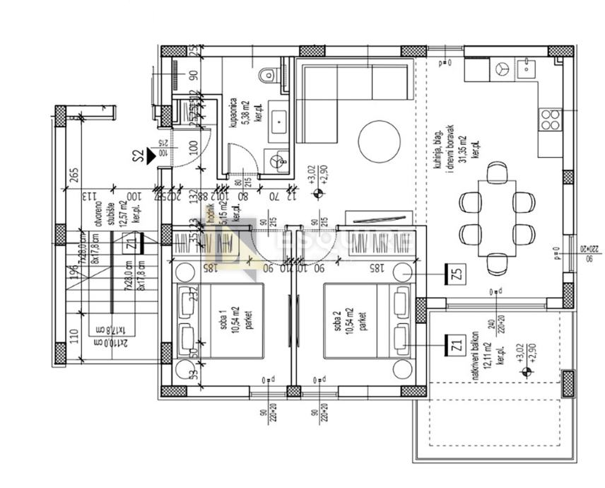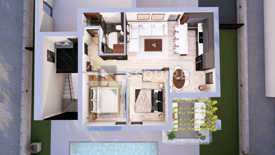 Stan S2 nudi izuzetno ugodan dnevni boravak koncepta open space, povezan s modernom kuhinjom i blagovaonicom, čineći glavni prostor savršenim za druženje, odmor i funkcionalan svakodnevni život.