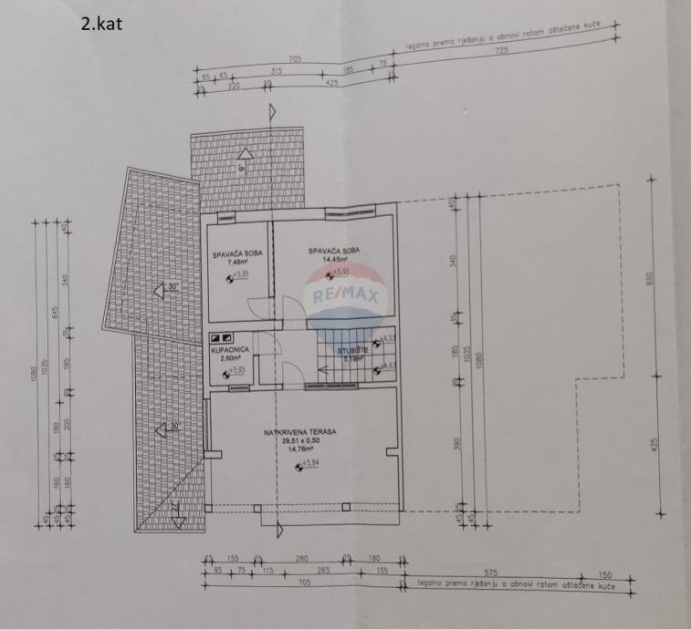 2. kat (56 m2) se sastoji od 2 spavaće sobe i kupaonice s toaletom te velike natkrivene terase (potencijal za ograditi po potrebi za kuhinjom na zasebnoj etaži).