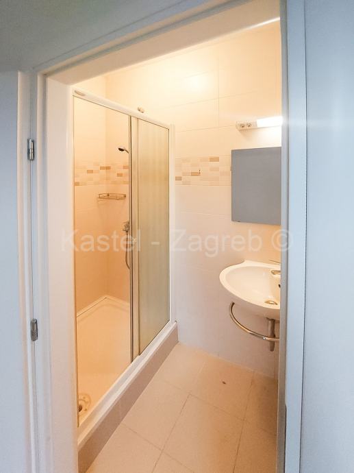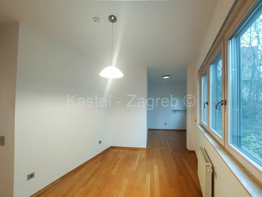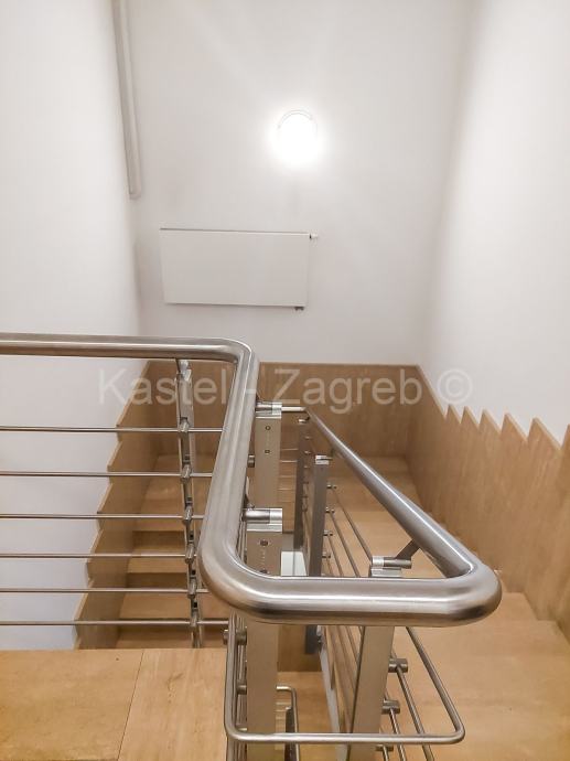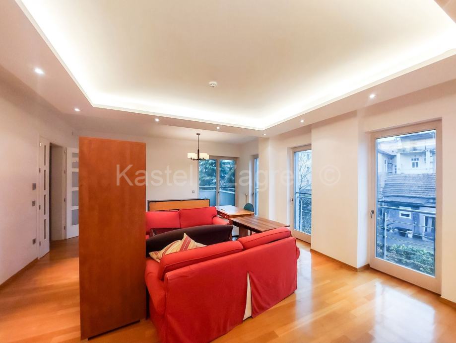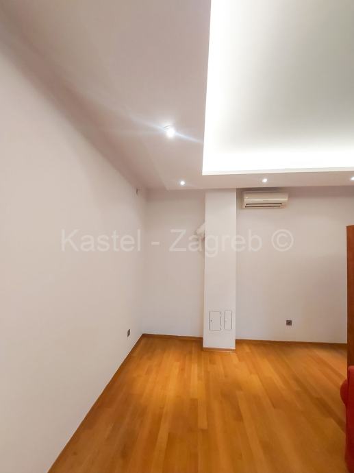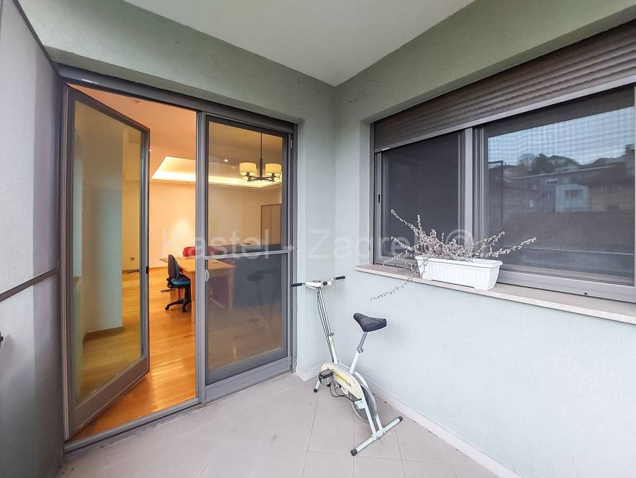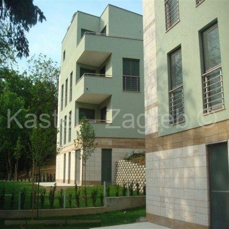 Stan u novijoj zgradi na odličnoj lokaciji, 10 min hoda do Kvaternikovog trga. Zgrada povučena od glavne prometnice okružena zelenilom. U zgradi samo tri stana s ugrađenim dizalom. Stan se sastoji od zatvorenog grijanog dijela 114 m2 kojeg čine dva hodnika, tri kupaonica, dnevni boravak, četiri sobe i lođa 6 m2 . Stanu pripadaju dva parkirna mjesta 30m2 ispred ulaza u zgradu. Sadašnji vlasnik originalni raspored dnevnog boravka prilagodio svojim potrebama knauf zidom, koji se lako ukloni.