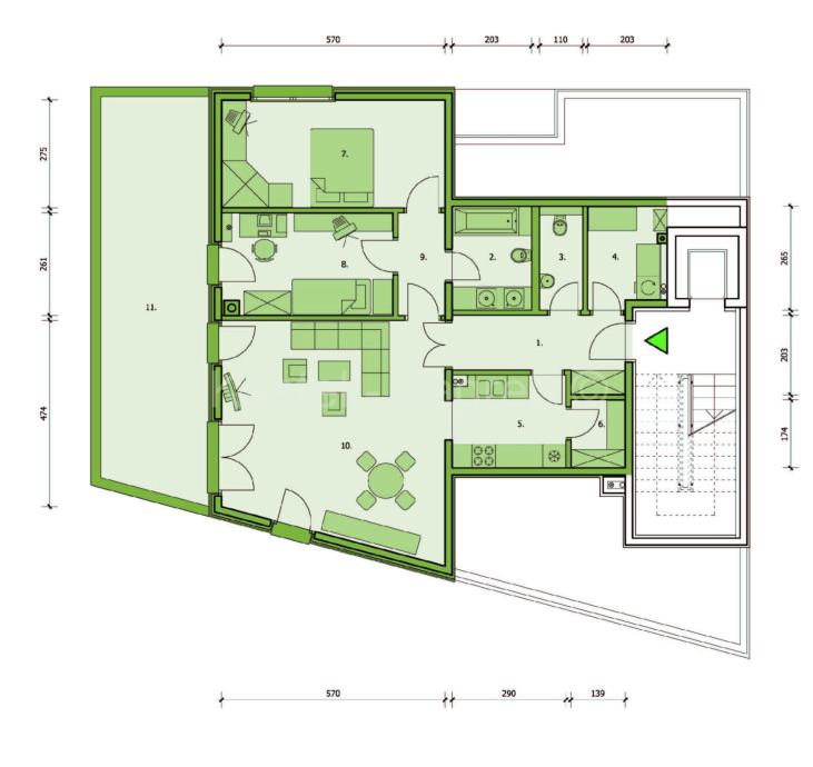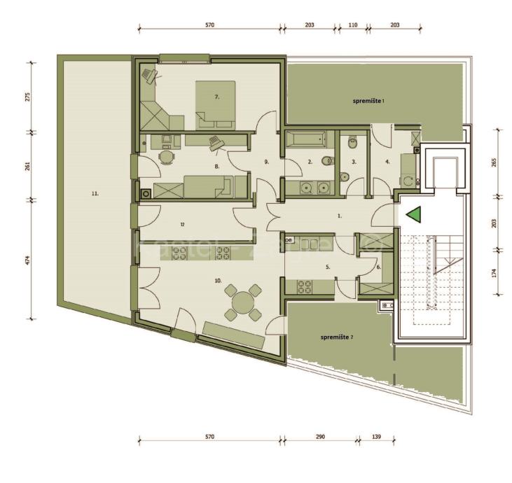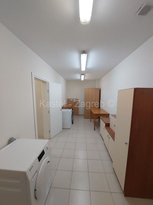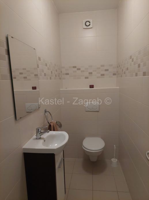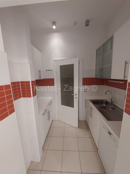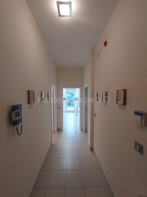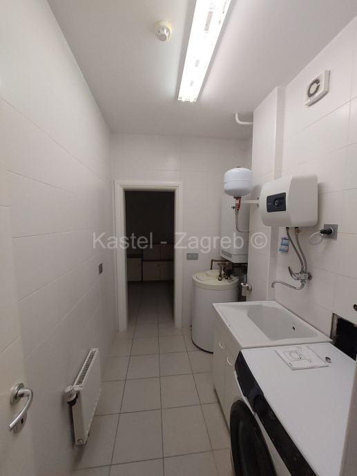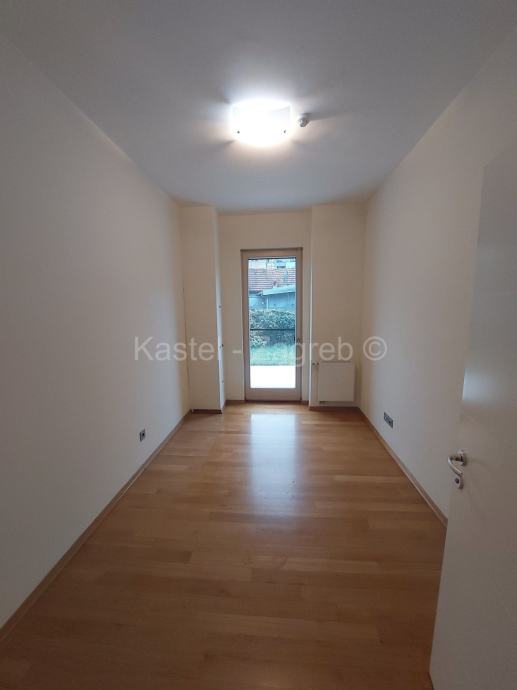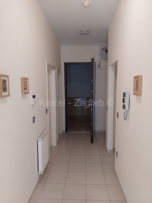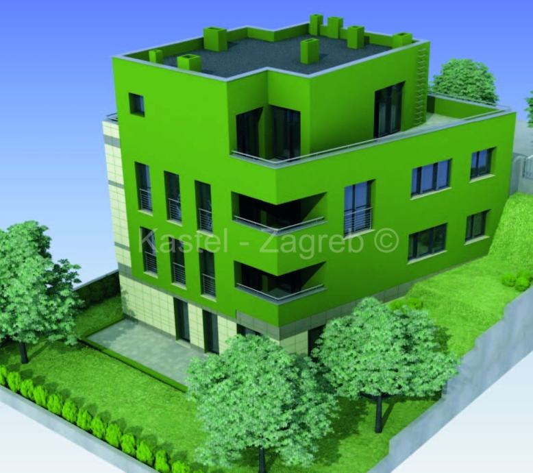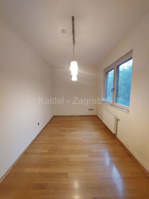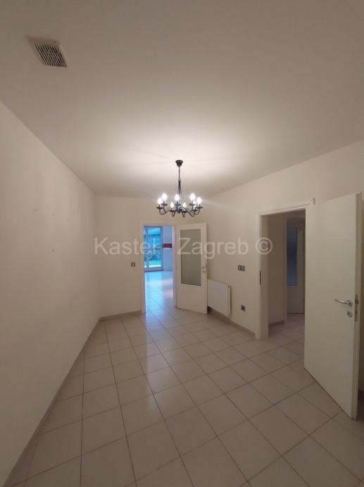 Stan u novijoj zgradi na odličnoj lokaciji, 10 min hoda do Kvaternikovog trga. Zgrada povučena od glavne prometnice okružena zelenilom. U zgradi samo tri stana s ugrađenim dizalom. Stan se sastoji zatvorenog dijela 127 m2 kojeg čine dva hodnika, kupaonica, wc, dvije kuhinje i blagovanjem, kotlovnica s vešerajem, izba, tri sobe, dvije prostorije (2 x 20 m2 tehnički podrum nije upisan u ZK, moguća sauna, teretana). Stanu pripada terasa površine 31,62 m2, vrt 140 m2 i dva parkirna mjesta 30m2 ispred ulaza u zgradu. Sadašnji vlasnik originalni raspored dnevnog boravka prilagodio svojim potrebama knauf zidom, koji se lako ukloni.