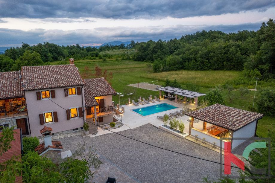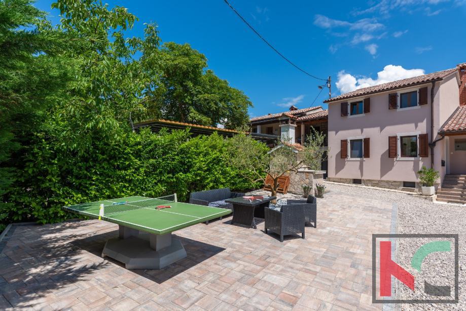 Na velikoj okućnici se nalaze parkirna mjesta za 7 vozila, bazen, natkriveni vanjski prostor za druženje pored bazena, bazen, veliki teniski teren, teren za odbojku i velika zelena površina za odmor i druženje.