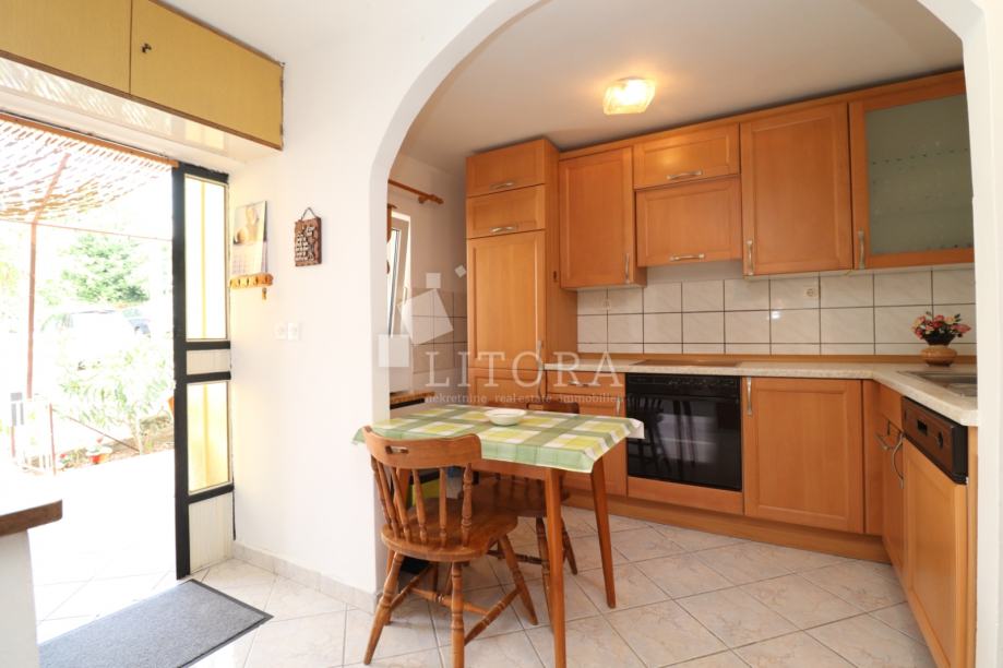 Sastoji se od dva zasebna apartmana te dodatne pomoćne kuće/dvorišne garaže. Prizemlje: natkrivena terasa, ulaz, spavaća soba, hodnik, dnevni boravak s kuhinjom, kupaonica. Prvi kat: vanjsko stubište vodi na kat gdje se nalaze dvije spavaće sobe, hodnik, kupaonica, kuhinja s blagovaonicom i dnevnim boravkom te izlaz na natkrivenu terasu s koje se pruža pogled na more. Kuća je samostojeća, sagrađena na parceli površine 160 m², raspolaže jednim parkirnim mjestom te garažom od 25,02 m². Udaljenost od plaže iznosi svega 140 m, dok je centar mjesta udaljen oko 700 m. Nekretnina posjeduje građevinsku dozvolu, ali nema uporabnu dozvolu – potrebno je pokrenuti proces legalizacije.