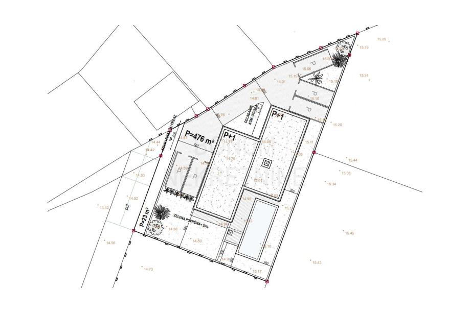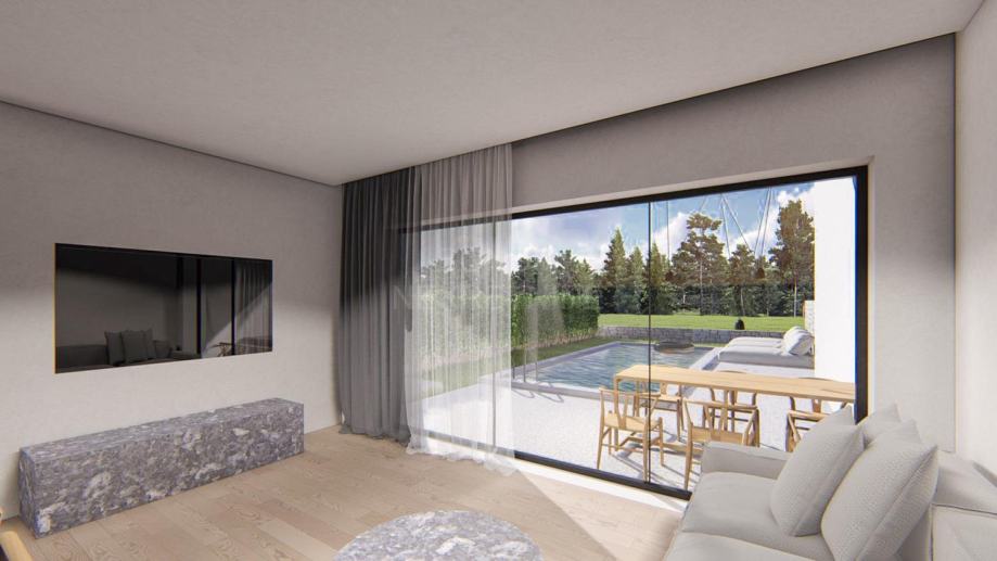 Prizemlje se sastoji od ulaznog hodnika, dnevnog boravka s kuhinjom i blagovaonicom u jednoj cjelini iz kojeg se izlazi na natkrivenu terasu, kupaonice te spremišta. Iz dnevnog boravka je izlaz na terase ispred kojih je bazen sa sunčalištem i uređenom okućnicom.