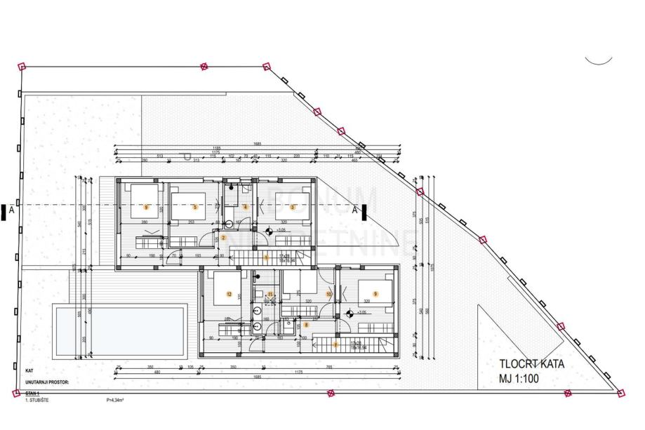 Unutarnjim stepenicama se dolazi na kat kuće gdje se još nalazi hodnik, tri spavaće sobe i kupaonica. Kući pripadaju i tri parkirna mjesta.