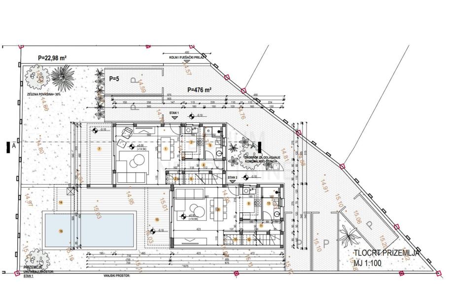 Prizemlje se sastoji od ulaznog hodnika, dnevnog boravka s kuhinjom i blagovaonicom u jednoj cjelini iz kojeg se izlazi na natkrivenu terasu, kupaonice te spremišta. Iz dnevnog boravka je izlaz na terase ispred kojih je bazen sa sunčalištem i uređenom okućnicom.