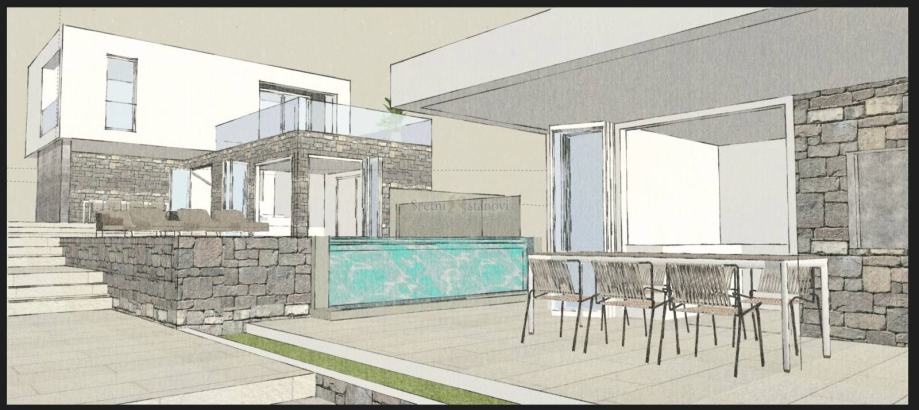 S obzirom na izgled same čestice u produžetku stambenog objekta pozicioniran je pravokutni bazen, a ispod njega pomoćni objekt – ljetna kuhinja. Zgrada će biti završno oblikovana ravnim krovom. Zgrada će biti spojena na komunalnu infrastrukturu. Nije predviđen pokusni rad objekta. Za predmetnu zgradu potrebno je ispuniti uvjete i zahtjeve koji su definirani u svim mapama, koje su sastavni dio ovog projekta, radi ispunjenja tehničkih svojstava projektiranog dijela građevine, te temeljnih zahtjeva za građevinu.