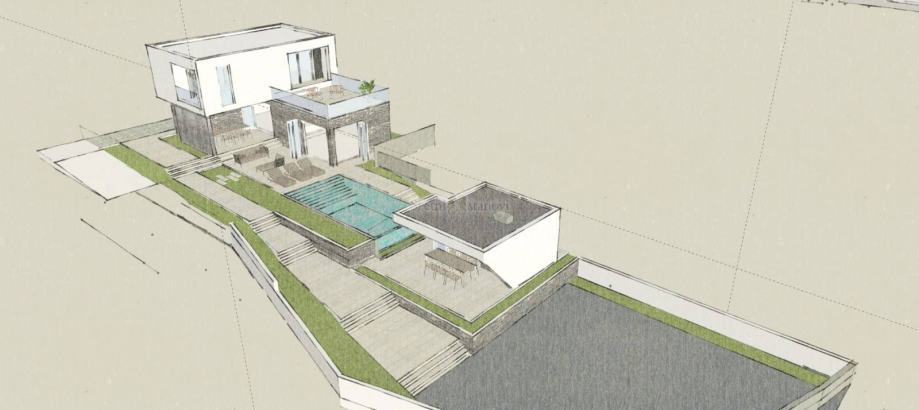 Prodaje se izvrsno građevinsko zemljište u Pirovcu s kompletnim projektom (glavni projekt arhitekture, građevinski projekt, projekt vodovoda i odvodnje, projekt toplinkse zaštite i uštede energije, glavni elektrotehnički projekt i strojarski projekt), pravomoćna građevinska dozvola se očekuje najkasnije u mjesecu studenom, a početni radovi na kući su započeti. Kuća je zamišljena kao luksuzna niskokatnica, koja se sastoji od prizemlja i prvog kata, ispred je zamišljen bazen kao i pomoćni objekt, koji bi eventualno mogao biti ljetna kuhinja ili prostor za goste. Stambeni objekt biti će smješten u sjevernom dijelu građevinske čestice, sa svake strane propisno udaljen od granica čestice (na strani pristupne ulice – regulacijskog pravca minimalno 4,00 m, a na svim ostalim stranama minimalno 1,00 m). ( čl.23, 32 i 35).