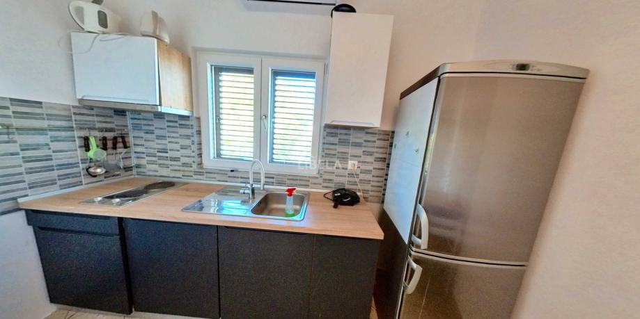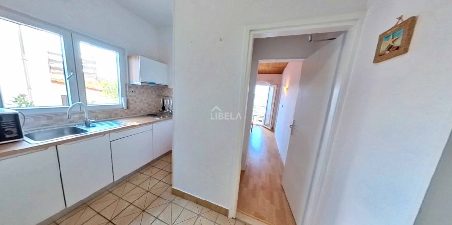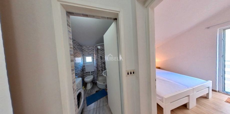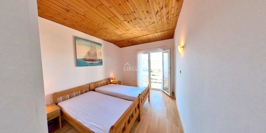 Drugi kat kuće (poseban ulaz) sastoji se od dva apartmana (6 soba, 4 kupaonice, 2 kuhinje s balkonima i pogledom na more). Prizemlje koje čini prostorija (trenutno recepcija ) od 24m2 i konoba (34m2), te sanitarni čvor. Ukupno 264m2. Ispred je parking, 200m2. Kuća je etažirana. Sagrađena je 1989g