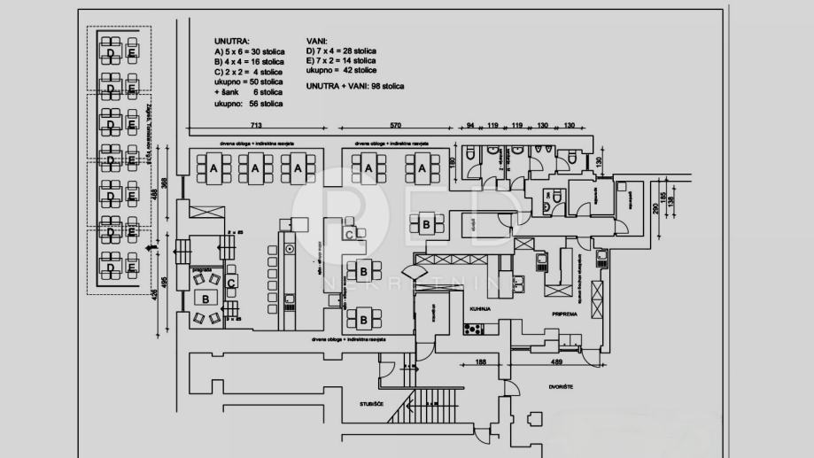 Sam prostor ima mogućnost postavljanja 56 sjedećih mjesta (stolovi s 4 i 6 stolica).