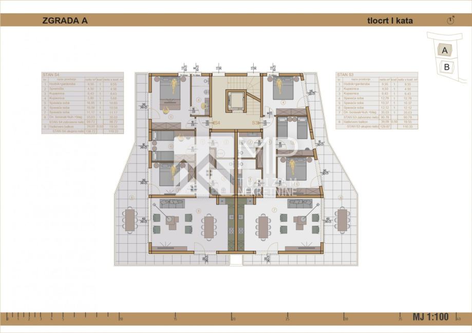 Predmetni stan nalazi se na I. katu zgrade "A", oznake "S4" ukupne korisne površine 119,22 m2. A čine ga hodnik + garderoba, dnevni boravak + kuhinja + blagovaonica, tri spavaće sobe, dvije kupaonice i natkrivena terasa.