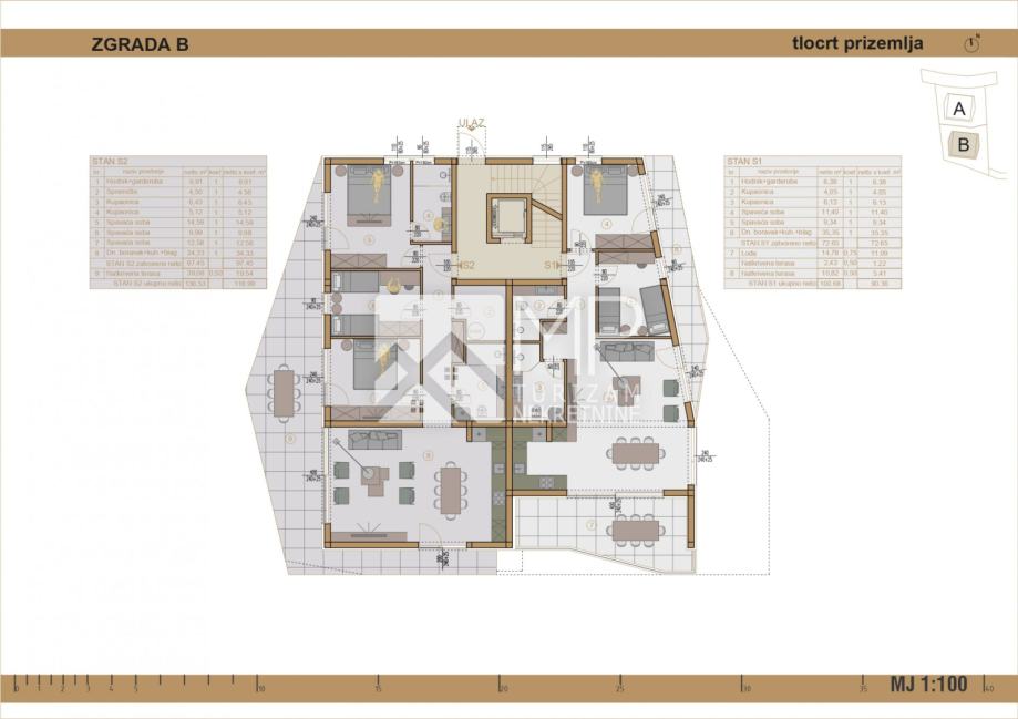 Predmetni stan nalazi se u prizemlju zgrade "B", oznake "S2" ukupne korisne površine 116,99 m2. A čine ga hodnik + garderoba, dnevni boravak + kuhinja + blagovaonica, tri spavaće sobe, dvije kupaonice, natkrivena terasa i dvorište 81 m2.