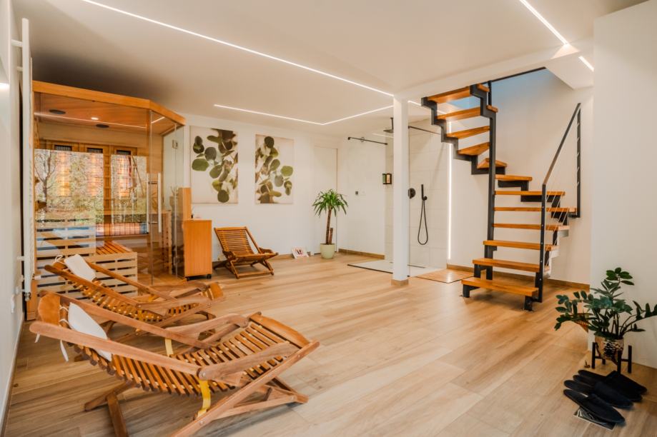 Na nižoj etaži nalazi se luksuzna spa zona, opremljena saunom i prostorom za opuštanje, koja vas poziva da se potpuno prepustite relaksaciji. Električno podno grijanje u ovoj zoni, kao i u svim kupaonicama, osigurava ugodnu toplinu tijekom cijele godine, stvarajući idealan prostor za opuštanje u privatnosti vlastitog doma.