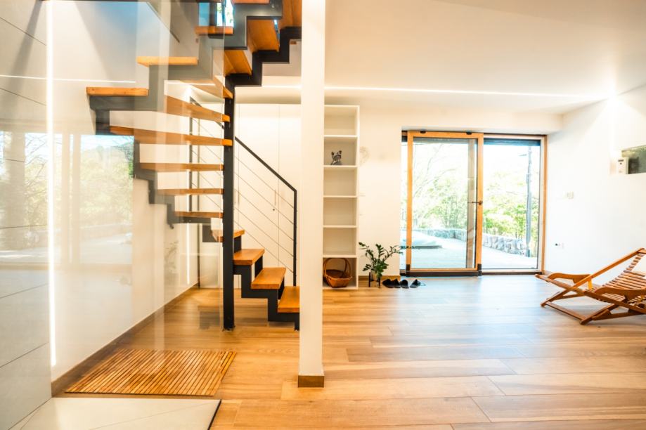 Ulaz u vilu vodi vas u prostrano prizemlje, gdje otvoreni koncept dnevnog boravka, kuhinje i blagovaonice stvara svijetao i ugodan prostor za obiteljska druženja. Velike staklene stijene spajaju interijer s vanjskom terasom, pružajući prekrasan pogled na okolni krajolik. Dnevni boravak dodatno grije kamin na drva, koji unosi toplinu i poseban ugođaj u zimske večeri, dok se ostatak kuće grije putem centralnog grijanja na struju.