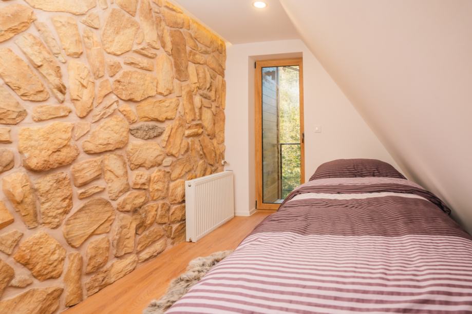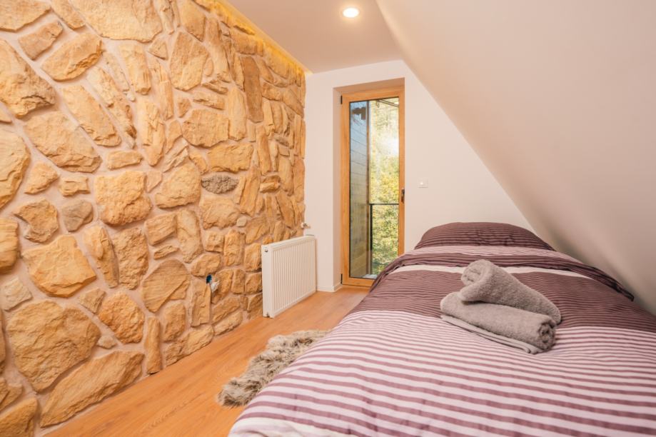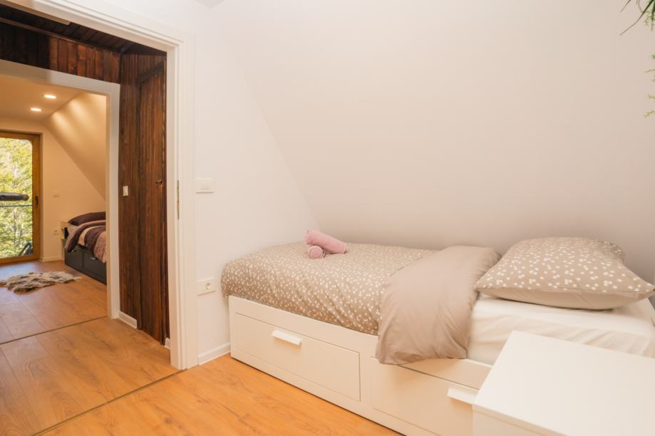 Gornja etaža vile nudi tri elegantno uređene spavaće sobe, svaka s izlazom na balkon, s kojih se pruža očaravajući pogled na okolne šume i planine. Dodatni toalet na ovoj etaži osigurava maksimalnu udobnost za sve članove obitelji i goste.