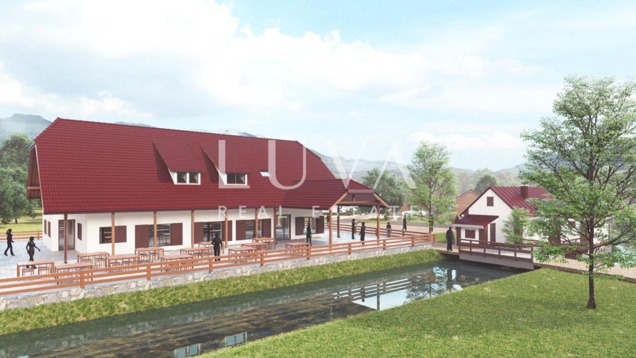 Na prodaju je iznimno atraktivan turističko-investicijski projekt smješten u netaknutoj prirodi podno planine Plješevice, svega 1,5 kilometara od Nacionalnog parka Plitvička jezera, u mjestu Kompolje Koreničko. Ovo prostrano imanje površine 27.840 m² čini jednu ograđenu cjelinu, a kroz njega u dužini od 400 metara protječe rijeka Matica, bogata autohtonom potočnom pastrvom, s izvorom udaljenim samo nekoliko kilometara.