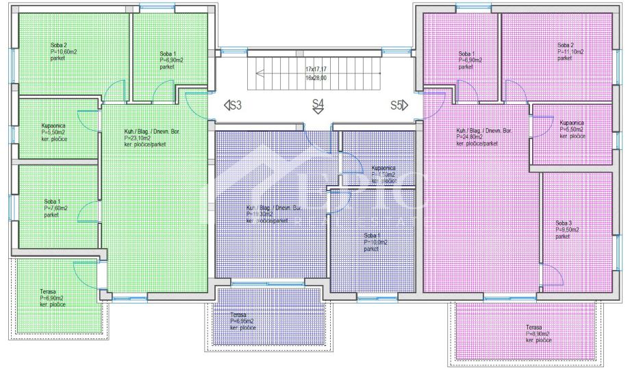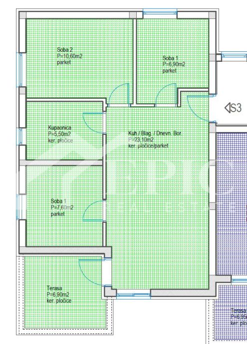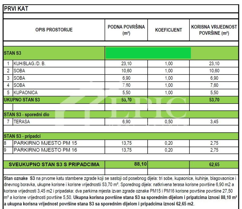 Stan oznake S3 u zgradi s osam stambenih jedinica, sastoji se od - kuhinje s blagovaone i dnevnog boravka, triju spavaćih soba, kupaonice i natkrivene terase. Stanu pripadaju i dva parkirna mjesta. Ukupna korisna površine stana S3 sa sporednim dijelom i pripatcima iznosi 88,10 m2 a ukupna korisna vrijednost površine stana iznosi 62,65 m2.