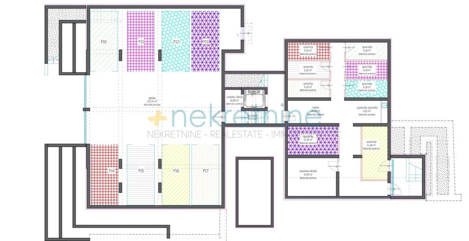 U podrumu se nalaze garažna mjesta, spremišta za stanare te zajednički prostor za korištenje prema dogovoru vlasnika.Na okućnici ispred zgrade osigurano je vanjsko parkirno mjesto za svaki stan.Oprema i značajke zgrade: Protupotresna armirano-betonska konstrukcija. Podno grijanje s dizalicama topline u svim prostorijama. Protuprovalna i protupožarna ulazna vrata sa zvučnom izolacijom. ALU stolarija s troslojnim IZO staklima. Električne rolete i komarnici. Termo i zvučna izolacija (10 cm fasada – stiropor). Lift kroz sve etaže. Prostrana garaža i spremišta.
