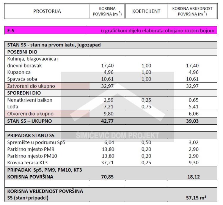 Prodaje se jednosobni stan u površini od 57,15 m2 u stambenoj zgradi od 8 stambenih jedinica. Stan se nalazi na prvom katu, sastoji se od kuhinje i dnevnog boravka, hodnika, kupaonice, spavaće sobe i lođe. Stanu pripadaju dva vanjska nenatkrivena parkirna mjesta, spremište u podrumu i krovna terasa. Mogućnost kupnje garažnog parkirnog mjesta.