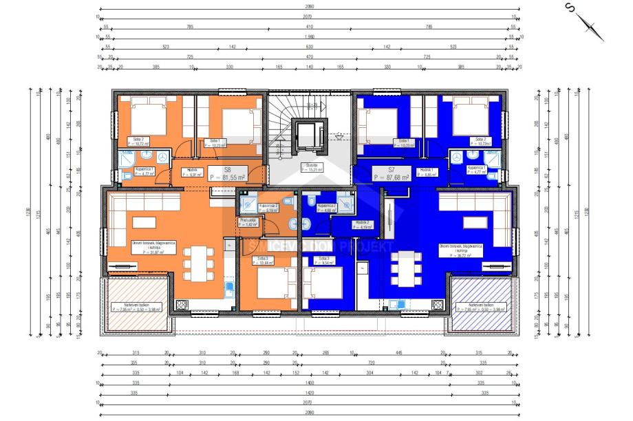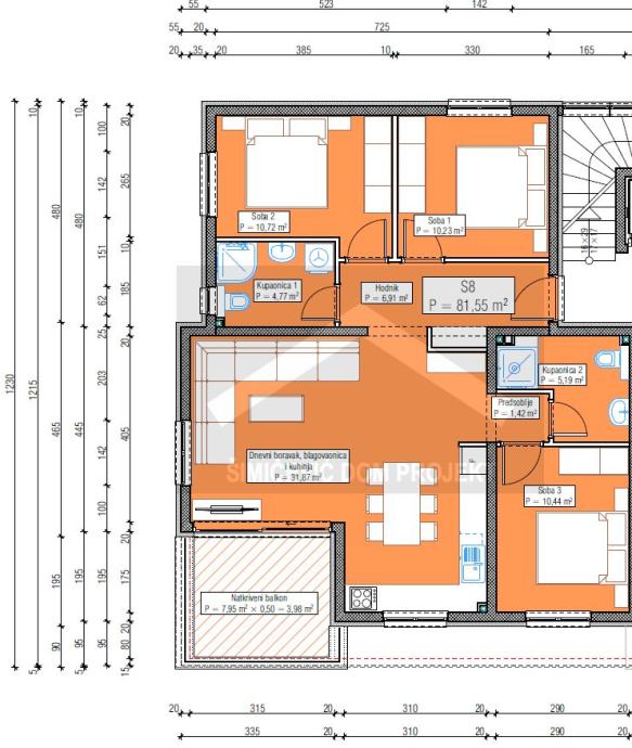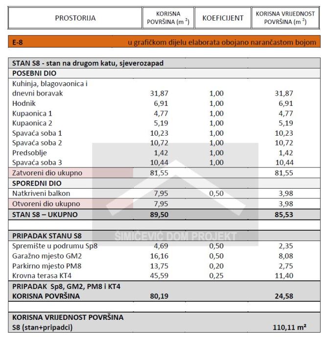 Prodaje se trosobni stan u površini od 110,11 m2 u stambenoj zgradi od 8 stambenih jedinica. Stan se nalazi na drugom katu, sastoji se od kuhinje i dnevnog boravka, hodnika, dvije kupaonice, tri spavaće sobe i natkrivenog balkona. Stanu pripada jedno garažno parkirno mjesto i jedno vanjsko nenatkriveno parkirno mjesto, spremište u podrumu i krovna terasa. Mogućnost kupnje drugog garažnog parkirnog mjesta.