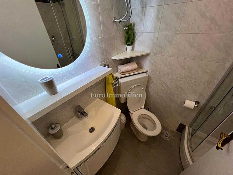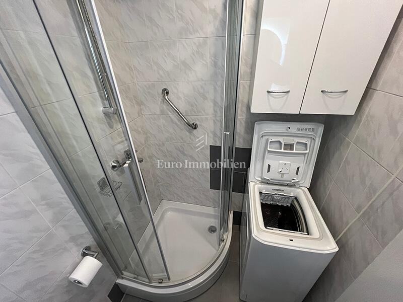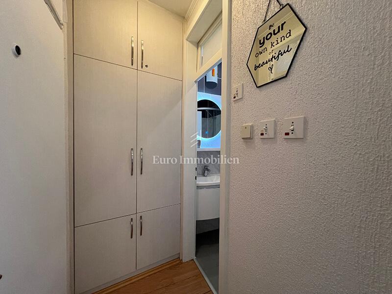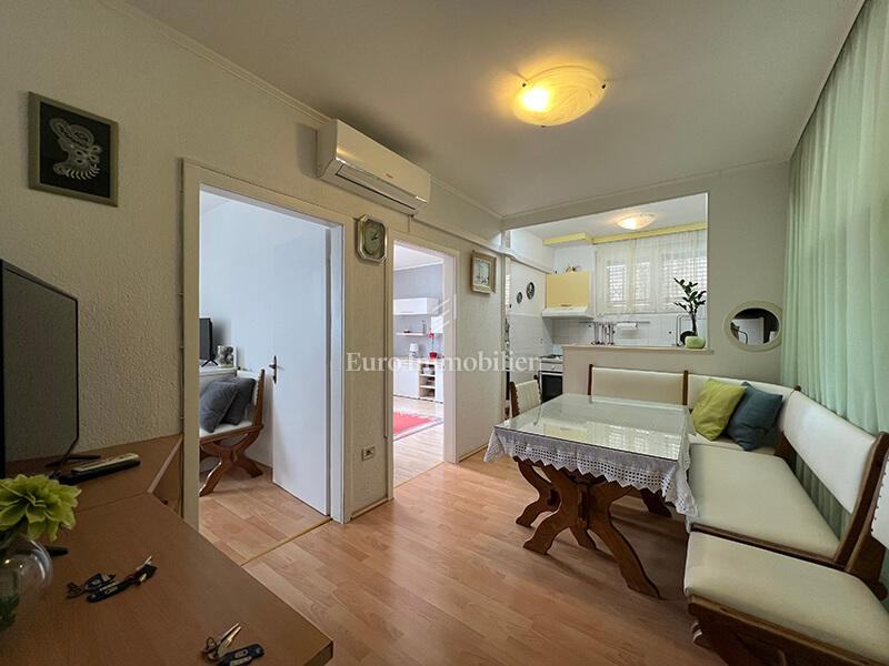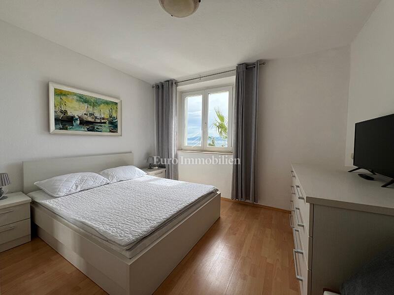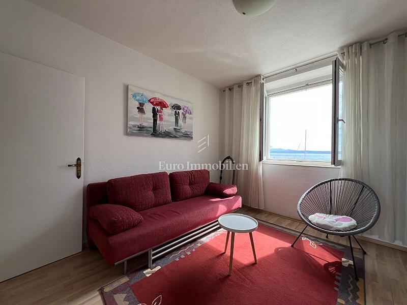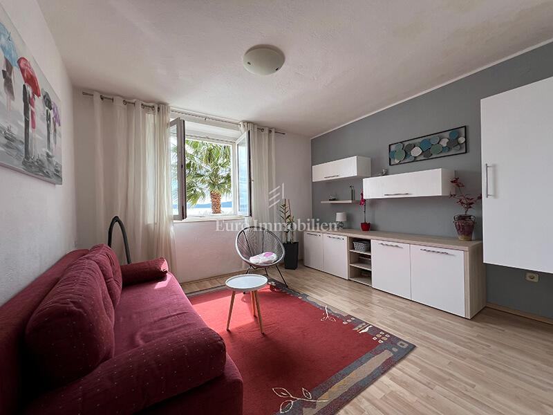 Stan se nalazi na prvom katu, vrlo je dobrog rasporeda i sastoji se od kuhinje i blagovaonice, hodnika, spavaće sobe, odvojenog dnevnog boravka koji može poslužiti i kao spavaća soba, kupatila i ostave. Obje sobe su južno orijentirane s lijepim pogledom na more, otoke i rivu u Podgori. Stan je namješten i klimatiziran te se takav prodaje. Vanjski parking moguće je iznajmiti od Općine Podgora, a nalazi se odmah ispred stana. Stan je odmah useljiv, a vlasništvo je uredno.