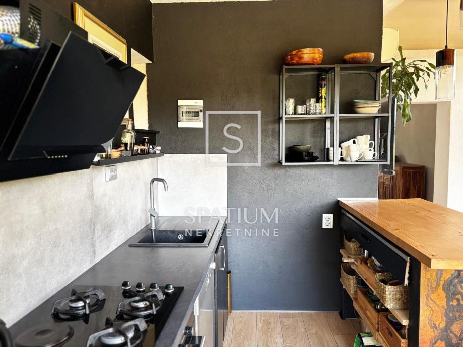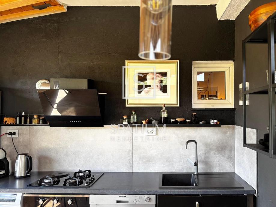 PODHUM, u ponudi imamo jedinstveni stan u kući površine 80 m², osmišljenoj u skladu s načelima minimalizma i prožeta prirodnim materijalima. Prostrani interijer čine dvije spavaće sobe, kupaonica te kuhinja povezana s prozračnim i svijetlim dnevnim boravkom. Klizna staklena stijena otvara prostor prema terasi i uređenom vrtu u kojem rastu bambus, masline, smokve i drenjula, pružajući pogled na mirno, zeleno okruženje. Poseban šarm domu daje namještaj, većinom ručno izrađen, dok dodatnu praktičnost osiguravaju vanjska parkirna mjesta, privatnost, mir, idealno za manju djecu i sigurno okruženje za kućne ljubimce.