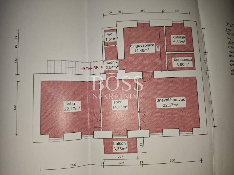 Podmurvice, stan je smješten na prvom katu lijepe vile sa samo četiri stana, južne je orijentacije pa je vrlo sunčan, a ima i lijep pogled. Sastoji se od tri sobe, kuhinje, kupaone, hodnika i balkona, a stanu pripada drvarnica. Etažno centralno grijanje na plin, a ima mogućnost grijanja na klimu s kojom je riješeno hlađenje. U stanu je PVC stolarija, dok su grilje aluminijske. Izuzetno ugodna nekretnina kojoj je potrebno osvježenje, ali ju lokacija, te manja zgrada s okućnicom čini ugodnom za miran obiteljski život. Boss, kontakt: 098/537-907 Jasna