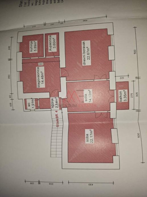 Iz ponude izdvajamo stan na prvom katu na Podmurvicama, površine 95.27m2 koji se sastoji od: hodnika, wc-a, blagovaonice, kuhinje, kupaonice, dnevnog boravka, dvije sobe, korisne (neto) površine 86,99 m2, sa balkonom ( 3,35 m2 ) s drvarnicom u dvorištu ( 4,93 m2). Stan je dio stare vile izgrađene 1914 godine sa obnovljenom fasadom. Javni parking je dostupan ispred zgrade. Centralno grijanje na plin te klima uređaj.