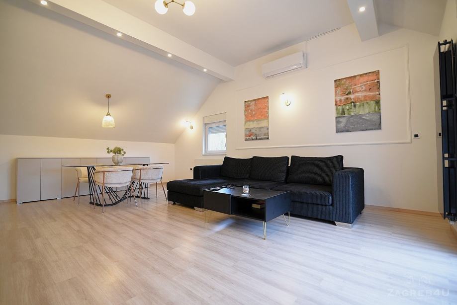The Zagreb4U Agency presents a modern 1-bedroom apartment (110 m2) on the 2nd floor, top floor, in the attic of a newer residential building, Podsljeme. There are three apartments in the building.
