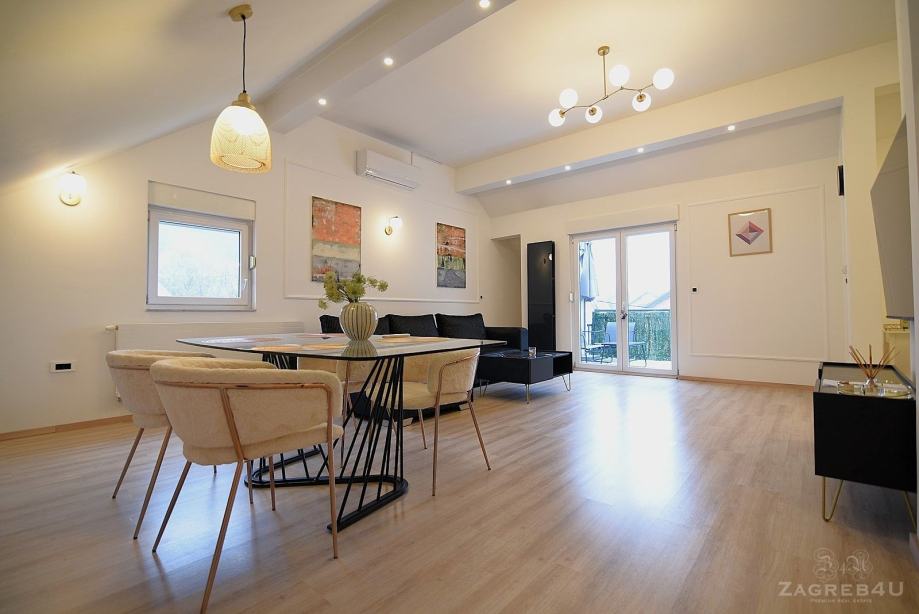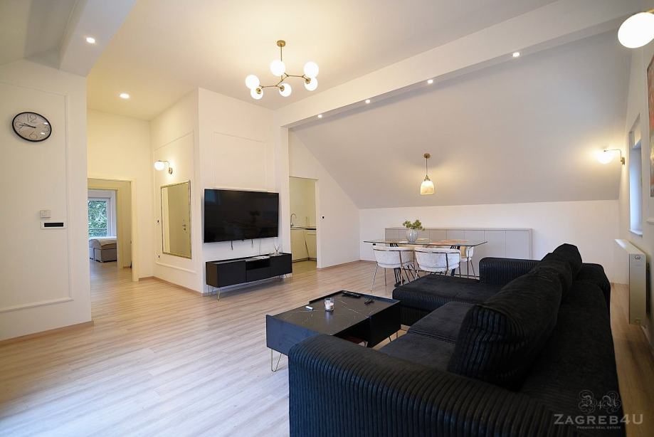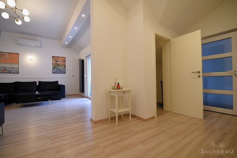 Agencija Zagreb4U predstavlja moderan 2-sobni stan (110 m2) na 2. katu, tj. zadnjem katu, u potkrovlju novije stambene zgrade, Podsljeme. U zgradi se nalaze tri stana.