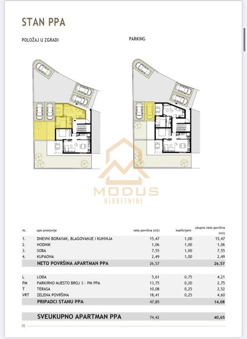 Ukupna površina = 74.42 m2 (obračunski: 40.65 m2)