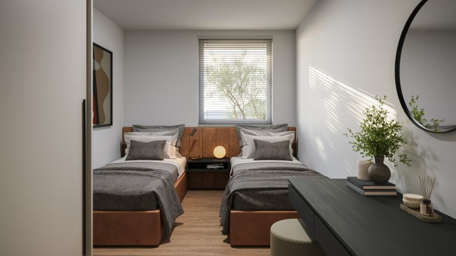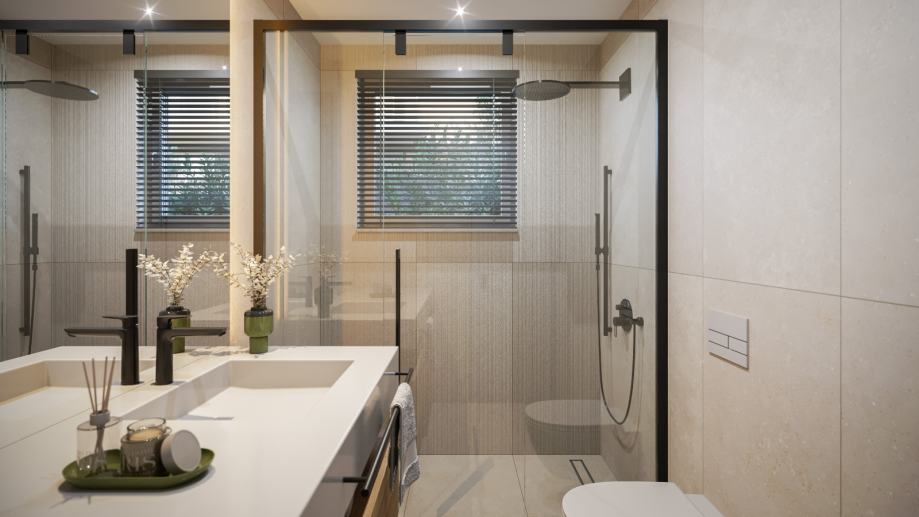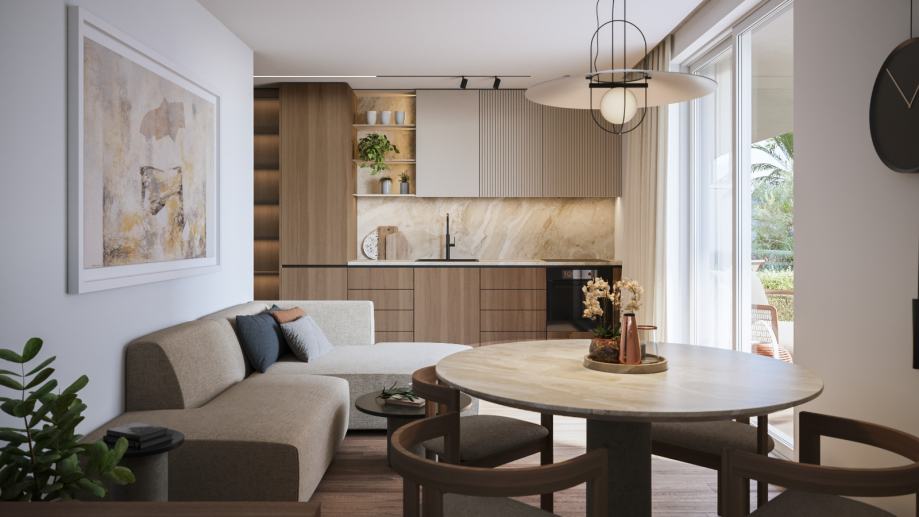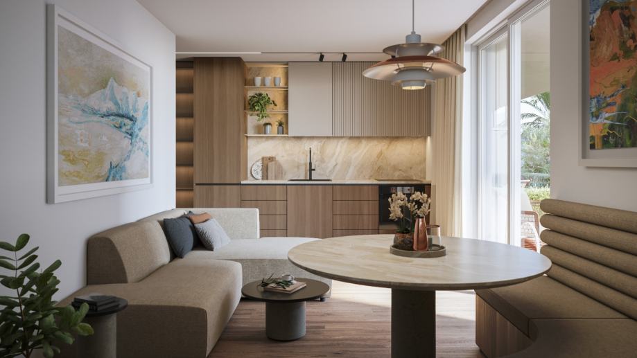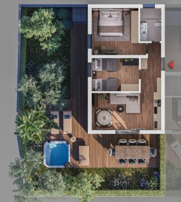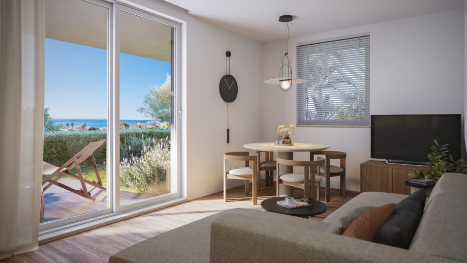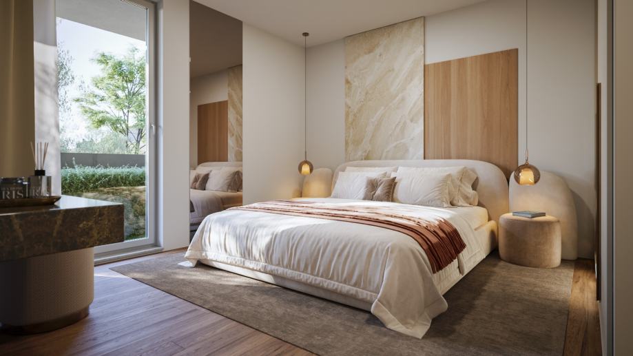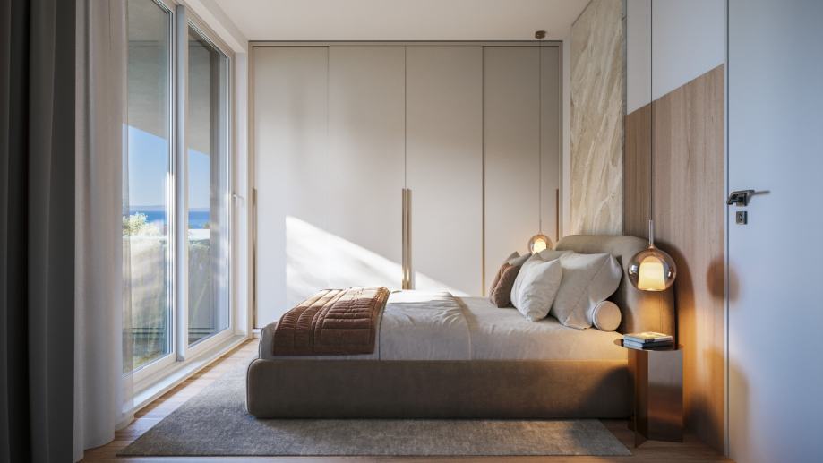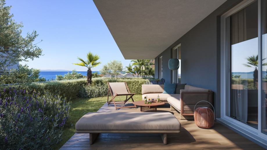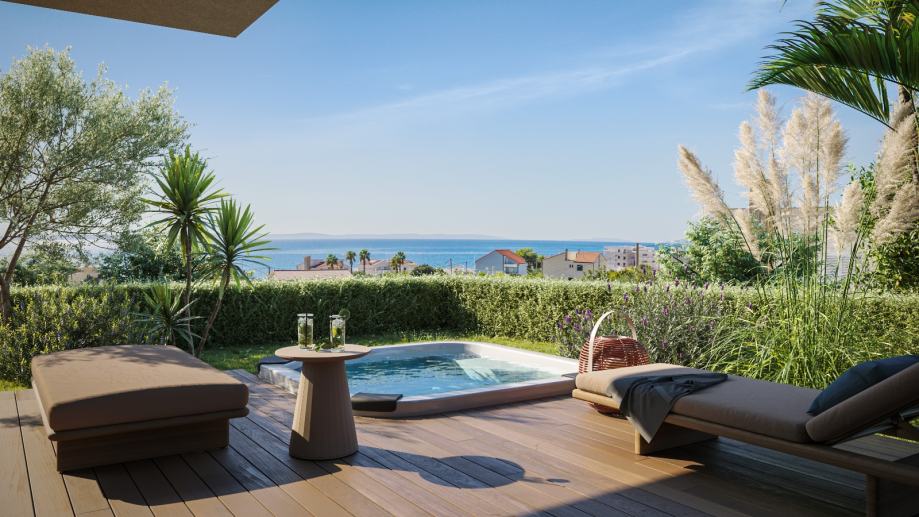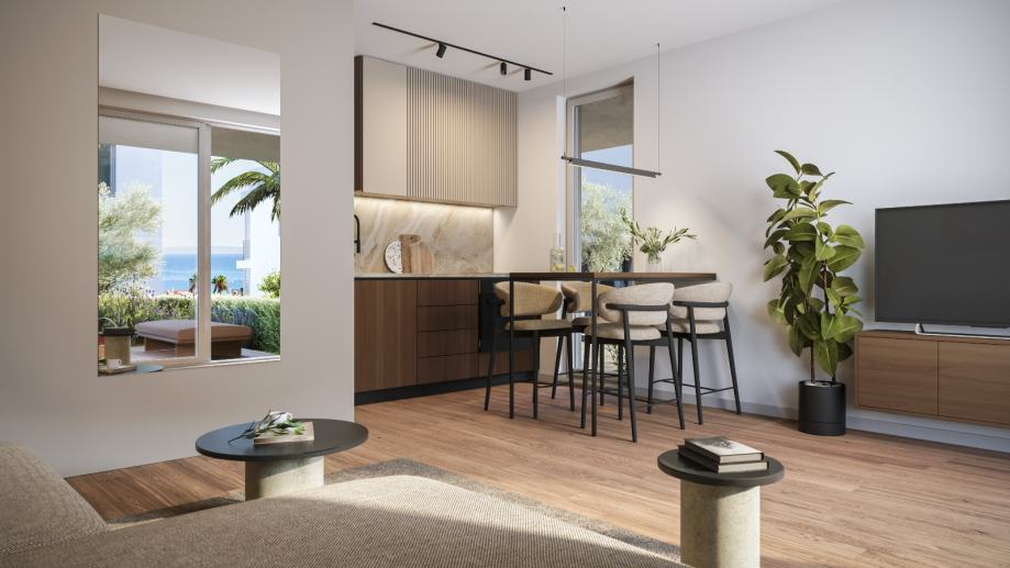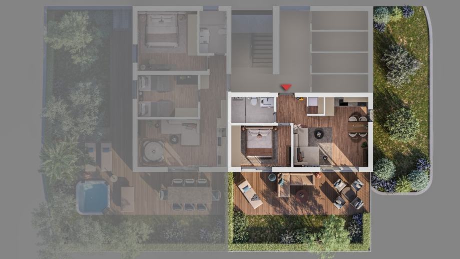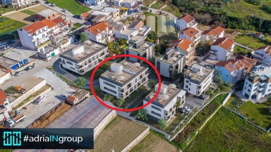 Dvosoban stan koji se sastoji od ulaza, garderobnog prostora, kuhinje, dnevne sobe i blagovaonice, spavaće sobe 1, spavaće sobe 2 s izlazom na zapadnu terasu i vrt, kupaonice s walk in tušem, natkrivene terase oko cijelog stana i prostranog južnog vrta s pogledom na more.