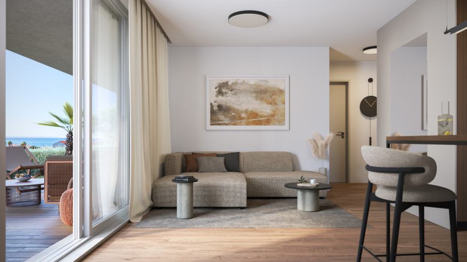 Two-room apartment consisting of an entrance, wardrobe, kitchen, living room, and dining room, bedroom 1, bedroom 2 with access to the western terrace and garden, bathroom with walk-in shower, covered patio around the entire apartment, and a spacious south-facing garden with a view to the sea.