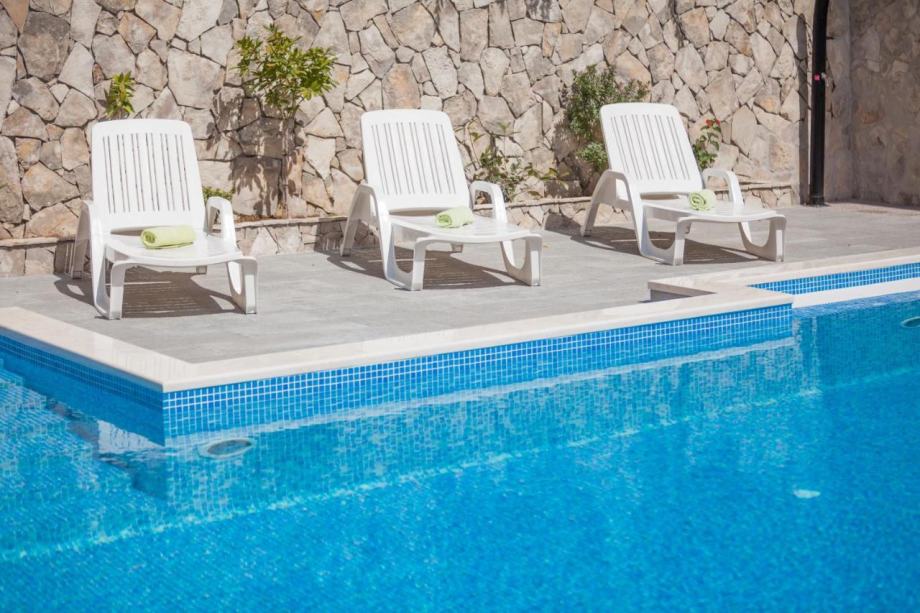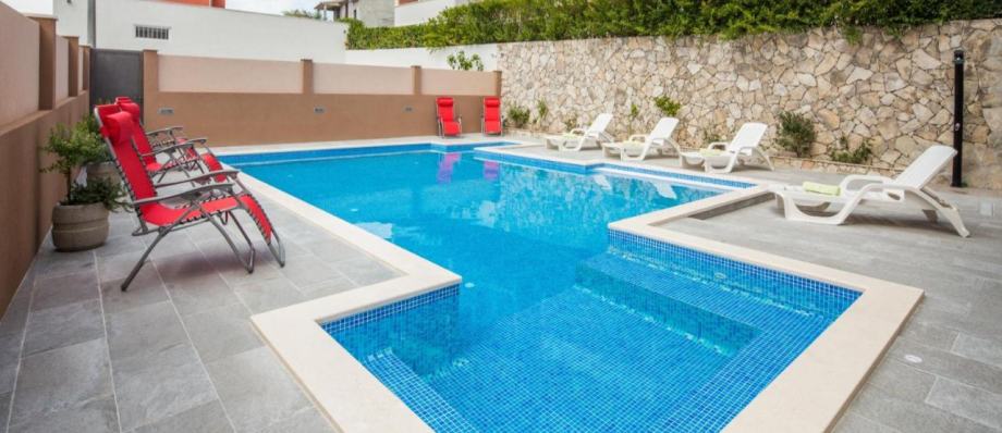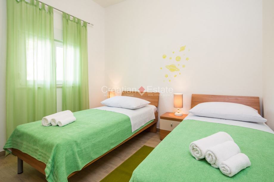 Podstrana, dvosobni stan s bazenom, dvorištem, terasama i podrumom (prodaja)