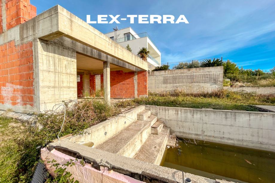 We present a house under construction with a valid building permit and complete project documentation, designed as a modern residential unit with a swimming pool and outdoor spaces.