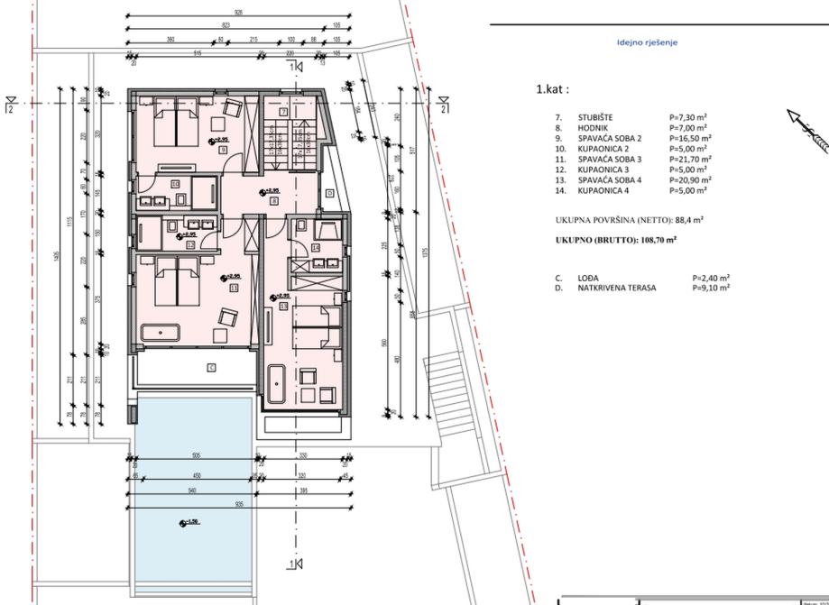 Na prvom katu će se nalaziti 3 sobe, svaka sa svojom kupaonicom.