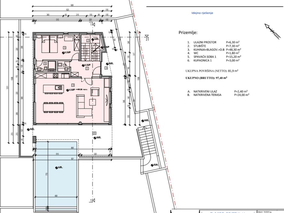 Na etaži prizemlja će biti veliki dnevni dio otvorenog koncepta (dnevni boravak, blagovaonica i kuhinja), jedna spavaća soba, kupaonica, WC i stubište.
