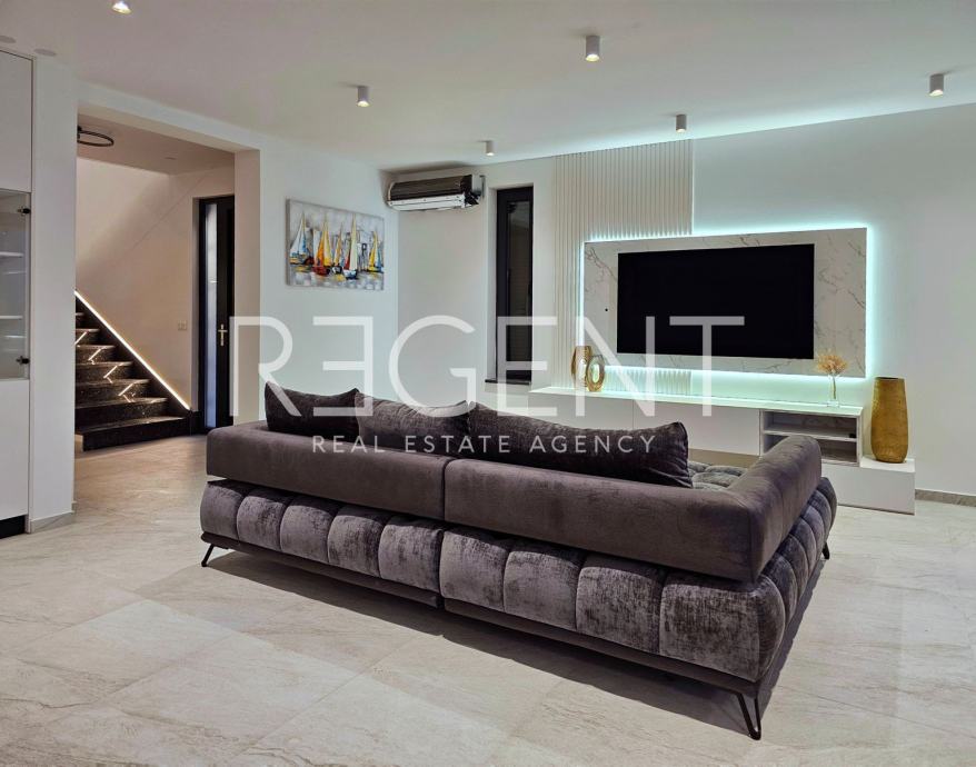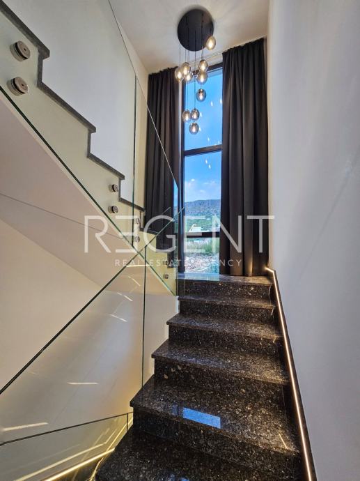 Posredujemo pri prodaji novoizgrađene moderne vile smještene u mirnoj okolici Splita, Podstrani, idealnoj za obiteljski život ili kao investiciji za turističko iznajmljivanje. Ova nekretnina nalazi se na zemljištu površine 600 m2, a prostire se na dvije etaže, ukupne stambene površine 320 m².Vila se sastoji od:Suterenskog prostora (99,1 m²): U suterenu se nalazi prostrana garaža, potpuno opremljen fitness studio sa saunom, te dodatni prostor koji je prilagodljiv za rekreaciju ili razne druge namjene.Prizemlja (81,9 m²): U prizemlju se nalazi ulazni prostor, stubište, moderna kuhinja s blagovaonicom, prostrani dnevni boravak, spavaća soba s en-suite kupaonicom te odvojeni toalet.Prvog kata (88,4 m²): Na posljednjoj etaži nalaze se tri spavaće sobe, svaka s vlastitom kupaonicom, što omogućuje maksimalnu privatnost i komfor.Dvorište i vanjski prostor usklađeni su s visokim standardima unutrašnjeg dizajna vile. Okućnica je pažljivo uređena mediteranskim biljkama, poput maslina i palmi. U dvorištu se nalaze tri parkirna mjesta, a središnji dio zauzima grijani bazen s klimatizacijom vode (s funkcijama grijanja i hlađenja), elektrolizom (slana voda) te četiri hidromasažne funkcije.Nekretnina se prodaje potpuno opremljena i spremna za useljenje. Smještena je samo 300 metara od mora, što omogućuje jednostavan pristup plaži.Ova nekretnina predstavlja idealan izbor za one koji traže mirno okruženje, uz blizinu svih potrebnih sadržaja za udoban život. S obzirom na svoju lokaciju i opremljenost, pogodna je i za cjelogodišnji boravak, kao i za investiciju u turističko iznajmljivanje.Za više informacija, kao i dogovor o razgledavanju, slobodno nas kontaktirajte!Za više informacija, kontaktirajte našeg agenta na brojeve telefona: