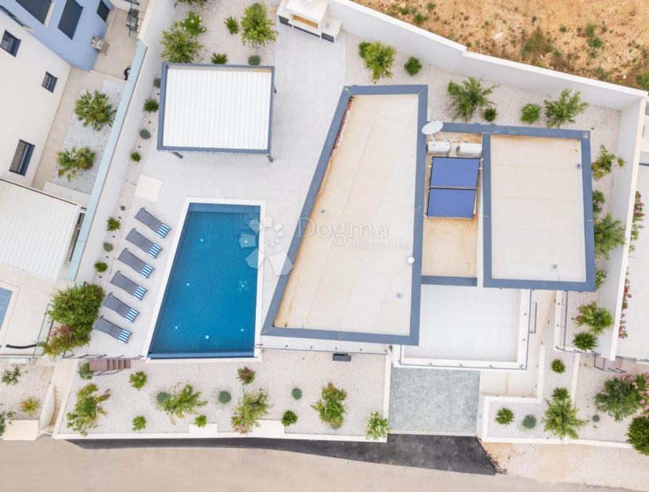 Ispred vile nalazi se prostrana terasa sa preljevnim bazenom , te kultivirani vrt s ugrađenim sustavom za navodnjavanje.