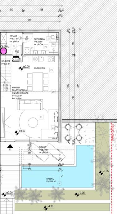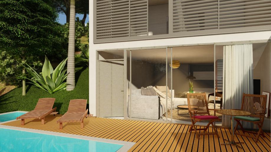 The first floor has a pleasant entrance area, a spacious living room with a kitchen and dining room with an open floor plan of 40 m2, and access to an uncovered terrace of 25 m2 with a swimming pool, bathroom and storage room.
